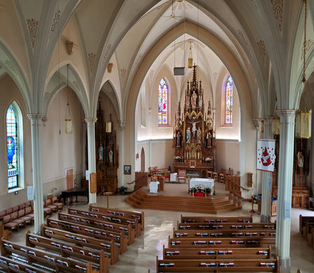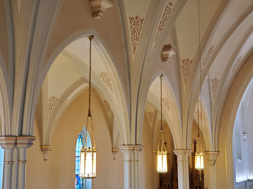 In need of a number repairs and improvements, Our Lady of the Lake Catholic Church underwent a $2.5 million renovation which impacted nearly every portion of the existing brownstone building. Renovations were made to the narthex, nave, sanctuary, social hall (including a new kitchen), access to choir loft improved, structural improvements made to the roof and nave, new pews and kneelers installed, new terrazzo floor laid, new sound system installed, bathrooms renovated to be handicap-accessible, mechanical and electrical systems replaced and the interior of the church completely repainted. Furthermore, a new addition was built to connect the church and the adjacent school building, providing a large covered drop-off area and entry for both areas. Thanks to this extensive work, Our Lady of the Lake continues to serve its 1,500 parishioners and present its beautiful architecture to all who visit Ashland.